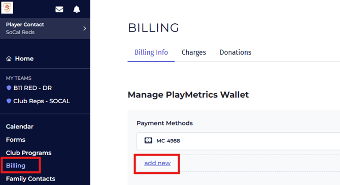 I need to change payment method: Please access Billing section from your desktop or mobile device, select add new under Manager PlayMetrics Wallet section, and provide credit card details.