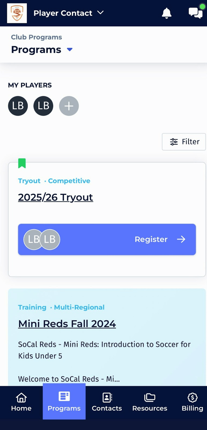 Register to tryout on PlayMetrics. Set up your account, add your players and complete the tryouts registration. Once registered, you should install the app for ease of use and for future notifications.